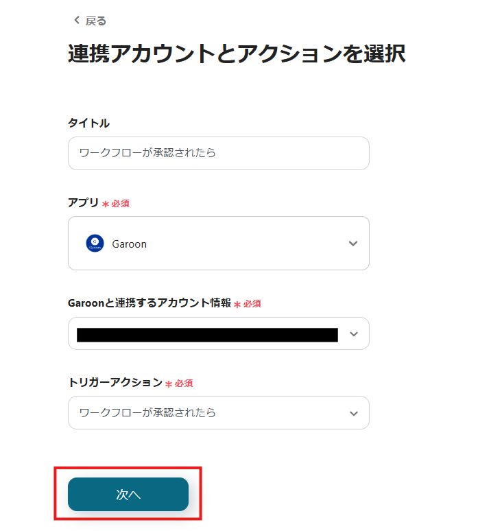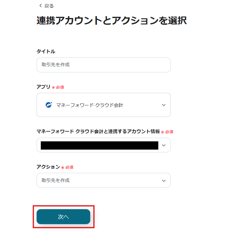 表示された画面で必須項目を入力し、「次へ」をクリックします。