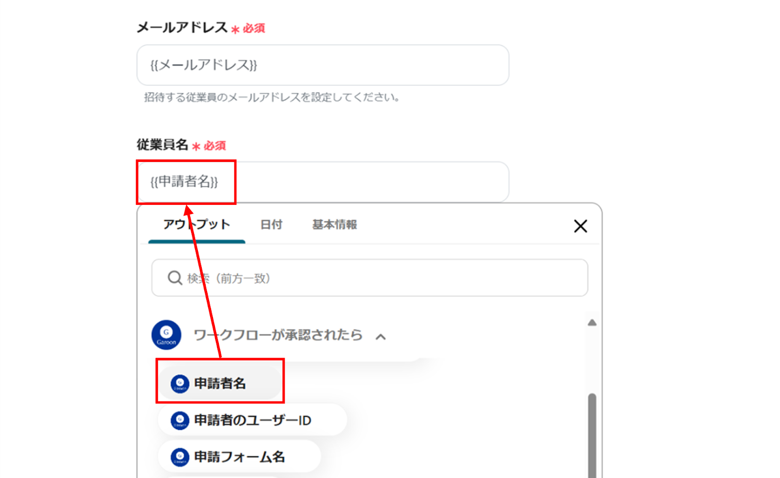 下へ進み、メールアドレス、従業員名をアウトプットを使って選択します。