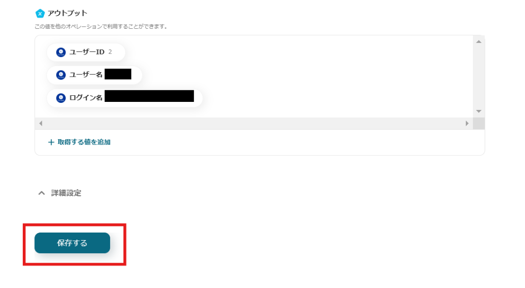 テストに成功すると、「取得した値(アウトプット)」が表示されます。