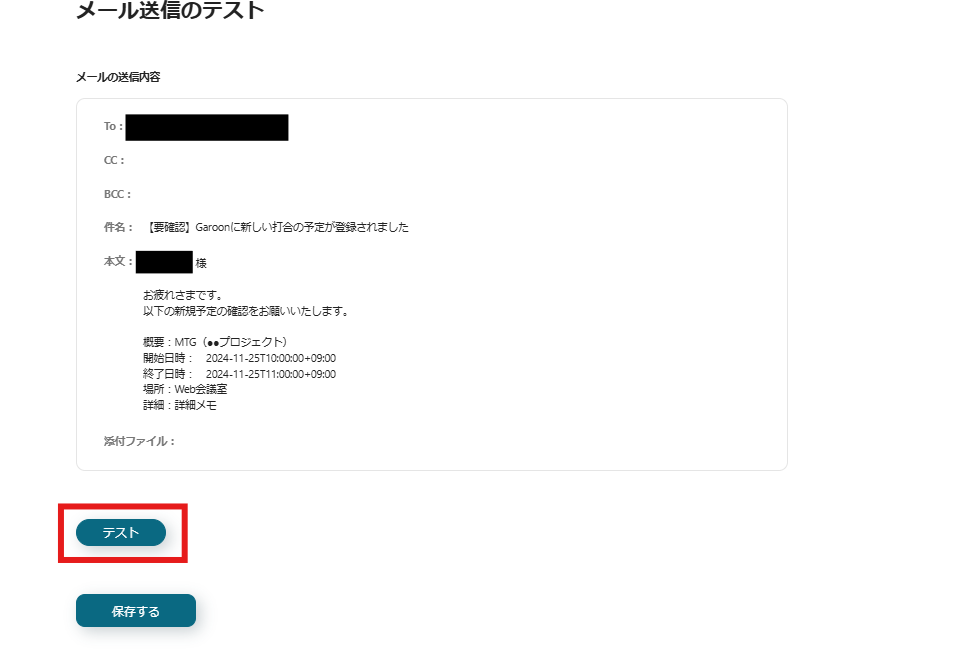 すべての設定が完了後、「テスト」をクリックします。
