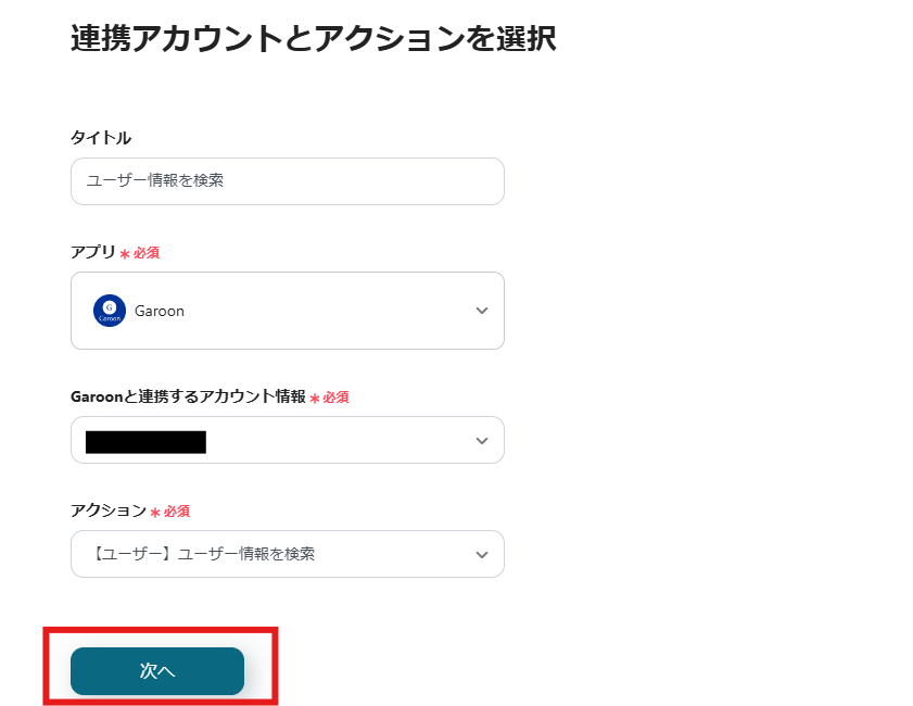 アクションが「【ユーザー】ユーザー情報を検索」であることを確認し、「次へ」をクリックします。