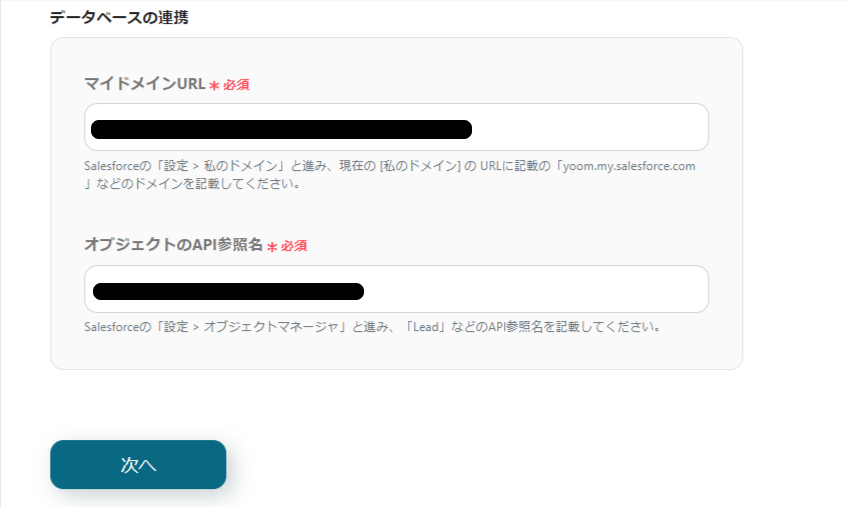 アカウント情報の下には、連携するデーターベースの情報を入力します。
