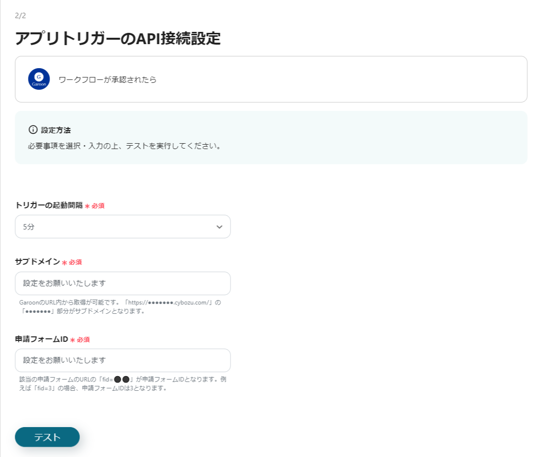 次に、トリガーの起動間隔とGaroonの詳細設定を設定を行います。