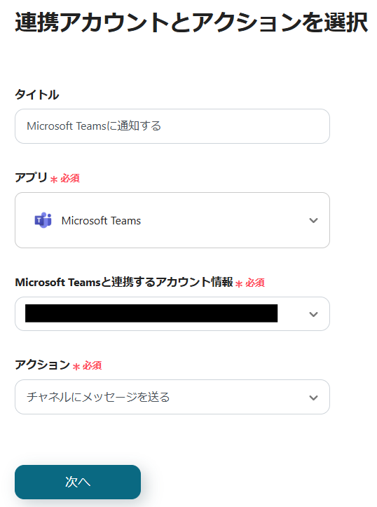 2.Microsoft Teamsと連携するアカウントを確認し、「次へ」をクリックします。