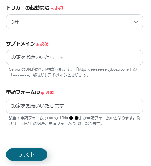 4.トリガーの起動間隔、サブドメイン、申請フォームIDを設定してテストを行います。