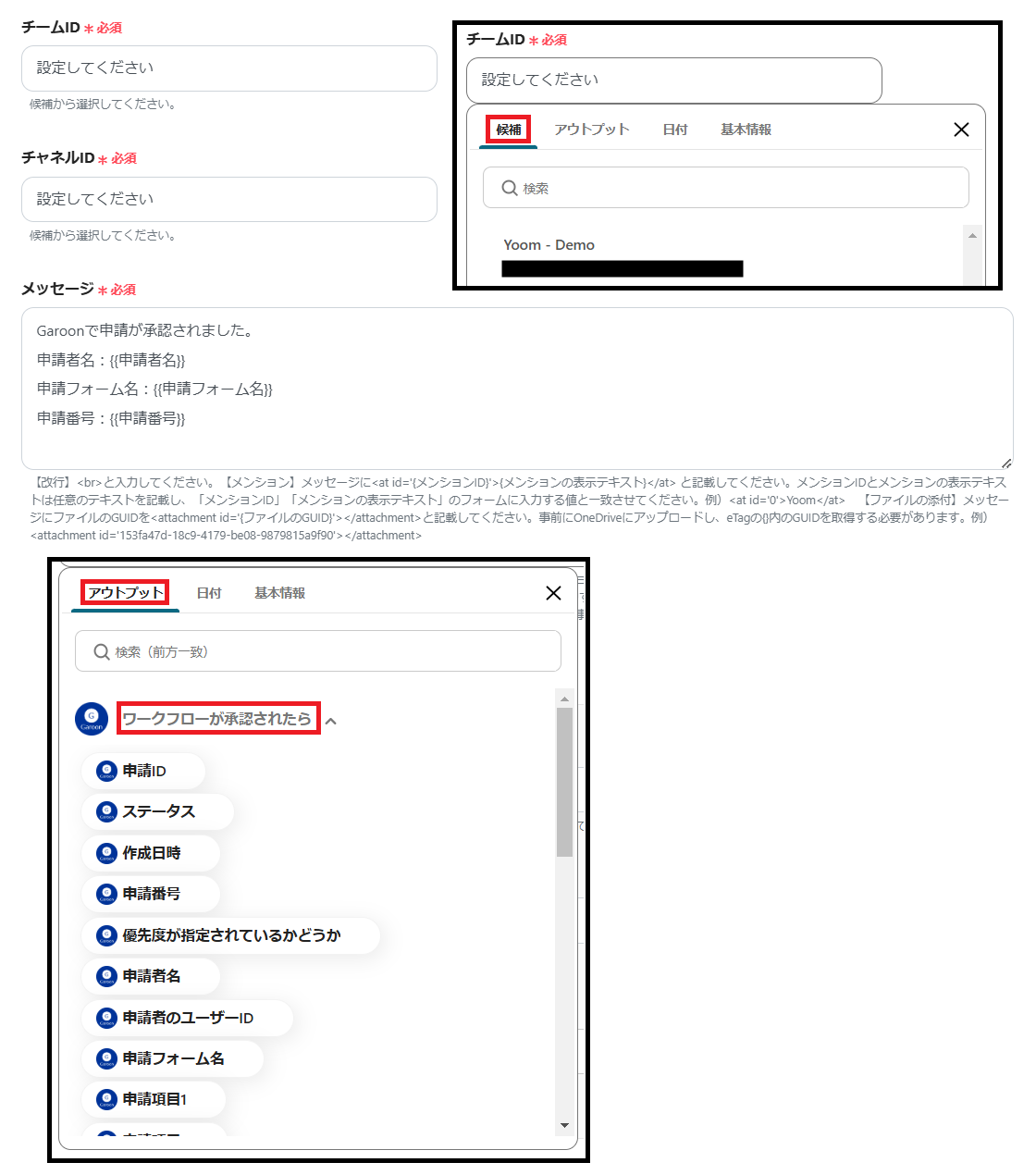 ※メッセージは、定型文を直接入力できます。Garoonの情報を反映させたいときは、枠をクリックして表示されるアウトプットの「ワークフローが承認されたら」から設定します。(値は二重括弧で表示されます)