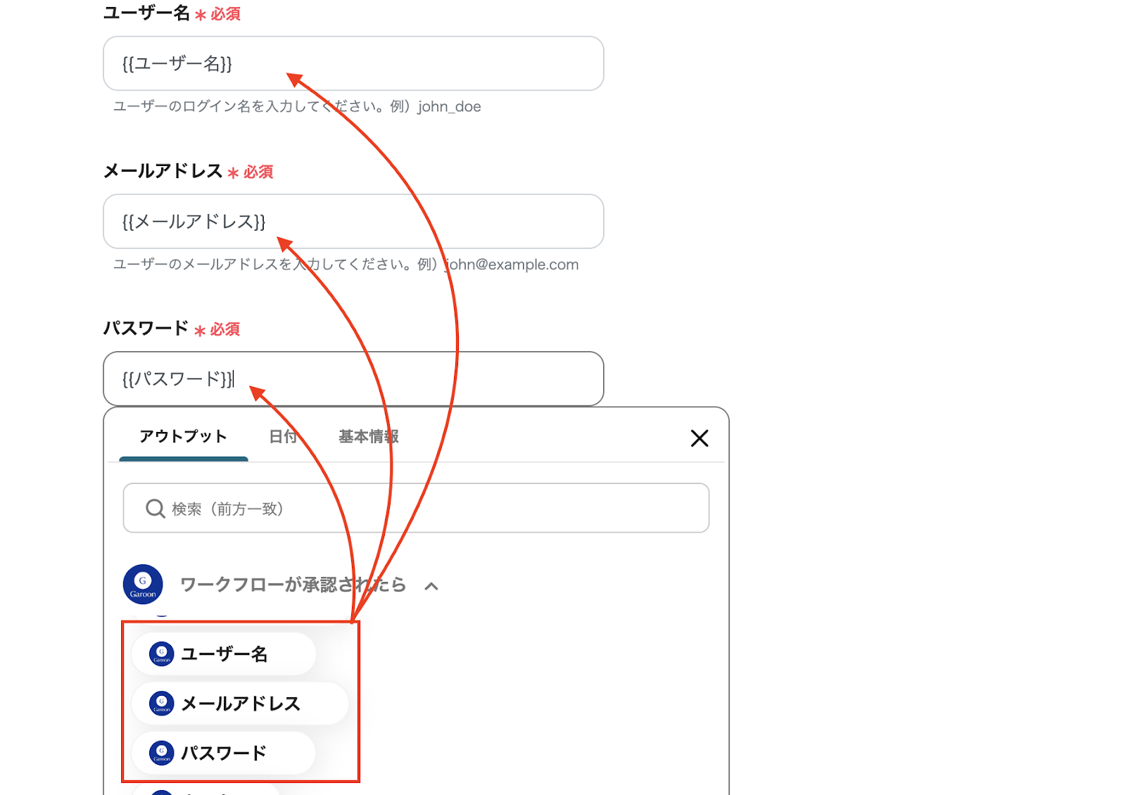 (以下は例として、前ステップで取得した「ユーザー名」と「メールアドレス」、「パスワード」の情報を引用したものです。)