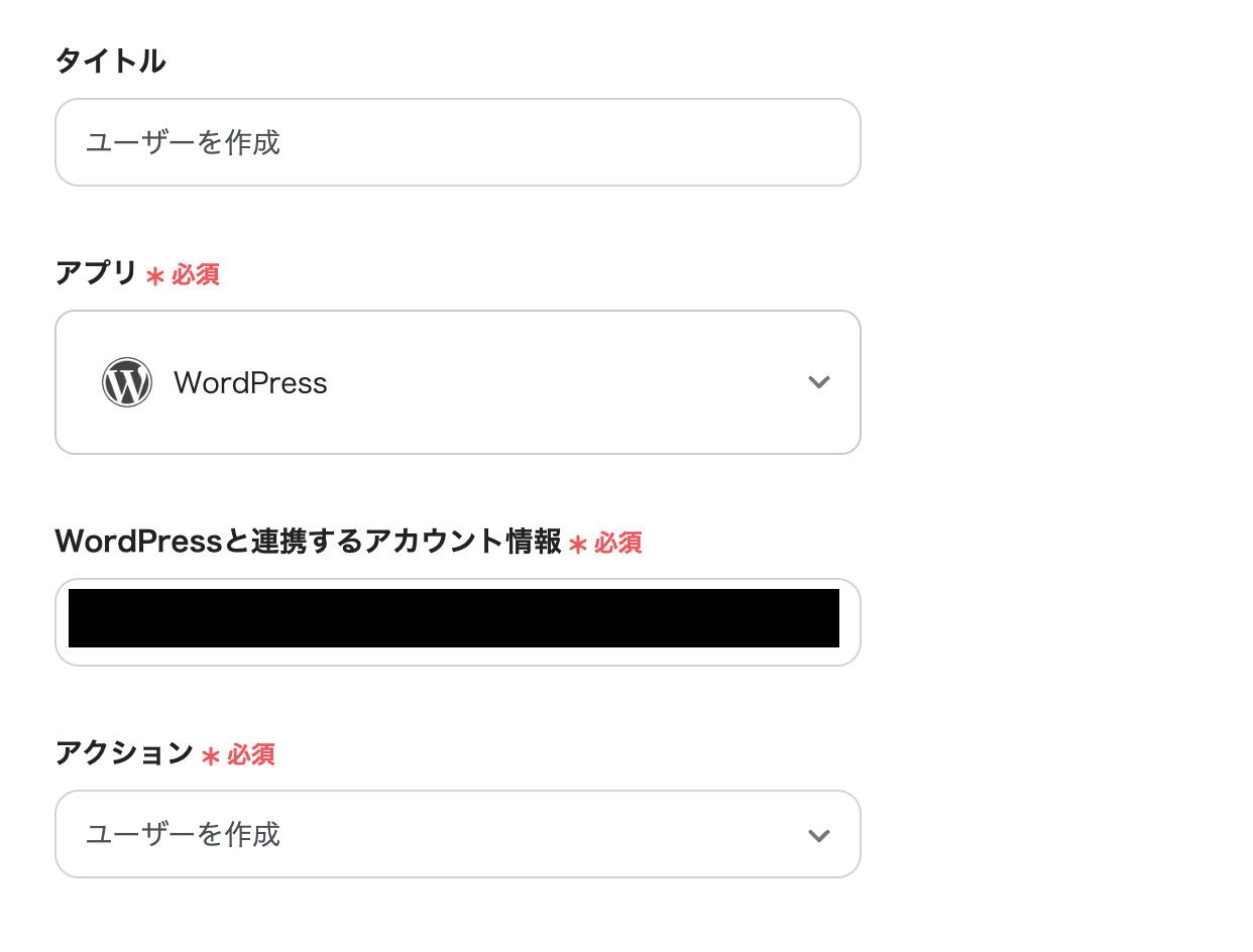 - 最後に、オペレーションでWordPress.orgの「ユーザーを作成」アクションを設定し、前段の手順で取得・加工した情報を紐付けてユーザーを自動作成します。