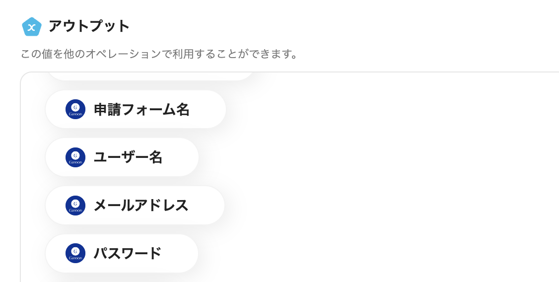 アウトプット情報は、「この値を他のオペレーションで利用することができます。」という注釈の通り、この後のステップで引用・活用できます。