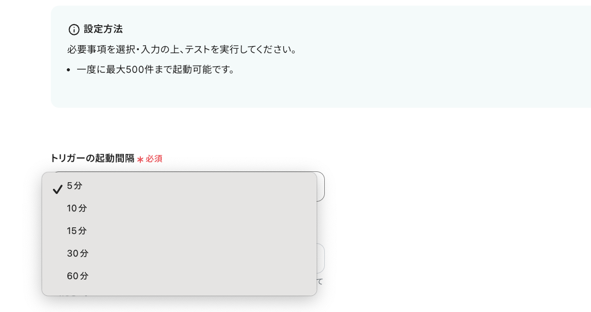 ※トリガーの起動タイミングは、5分、10分、15分、30分、60分のいずれかで設定できます。