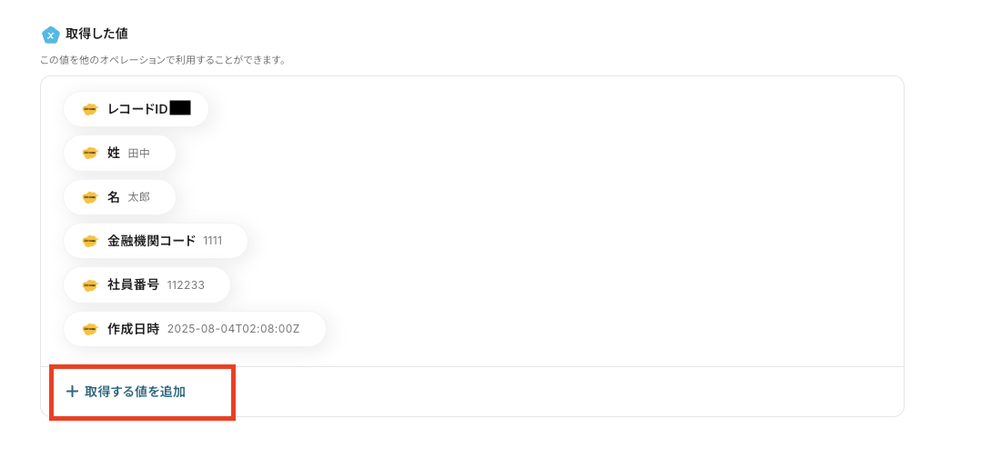 もし、取得値を追加したい場合には、【+ 取得する値を追加】をクリックすることでアウトプットを増やすことができます。