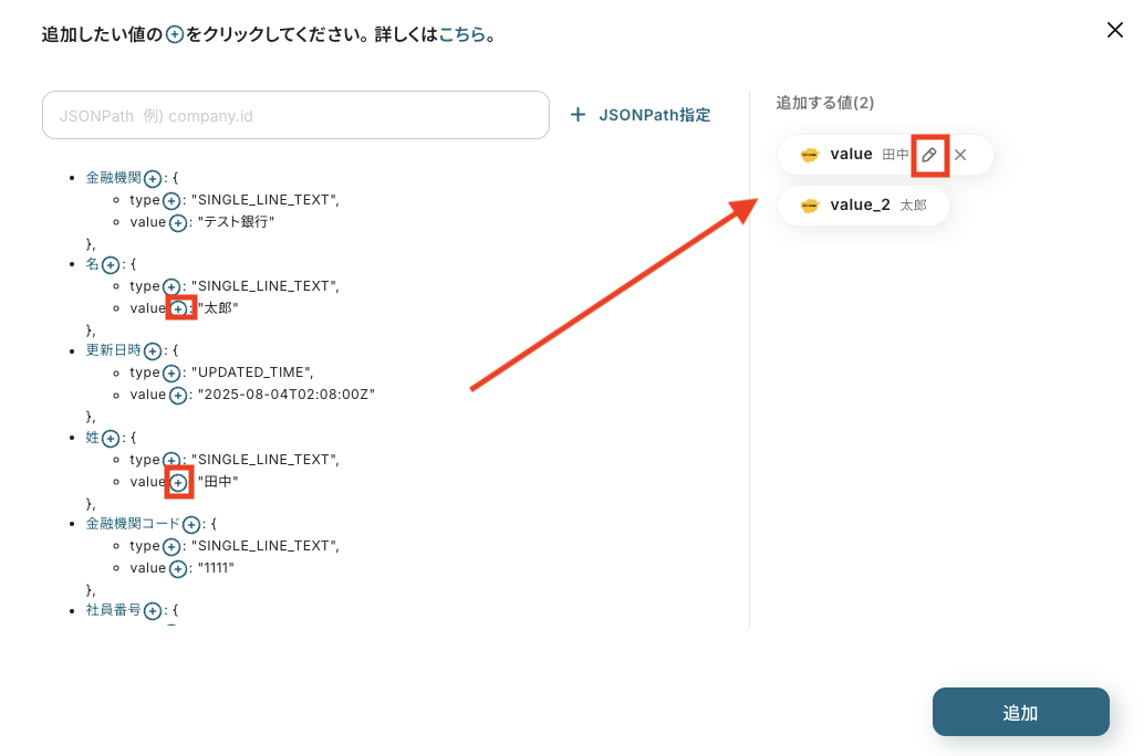 以下の画面のように取得したい情報の横にある+マークをクリックすると、『追加する値』の欄に情報が追加されます。