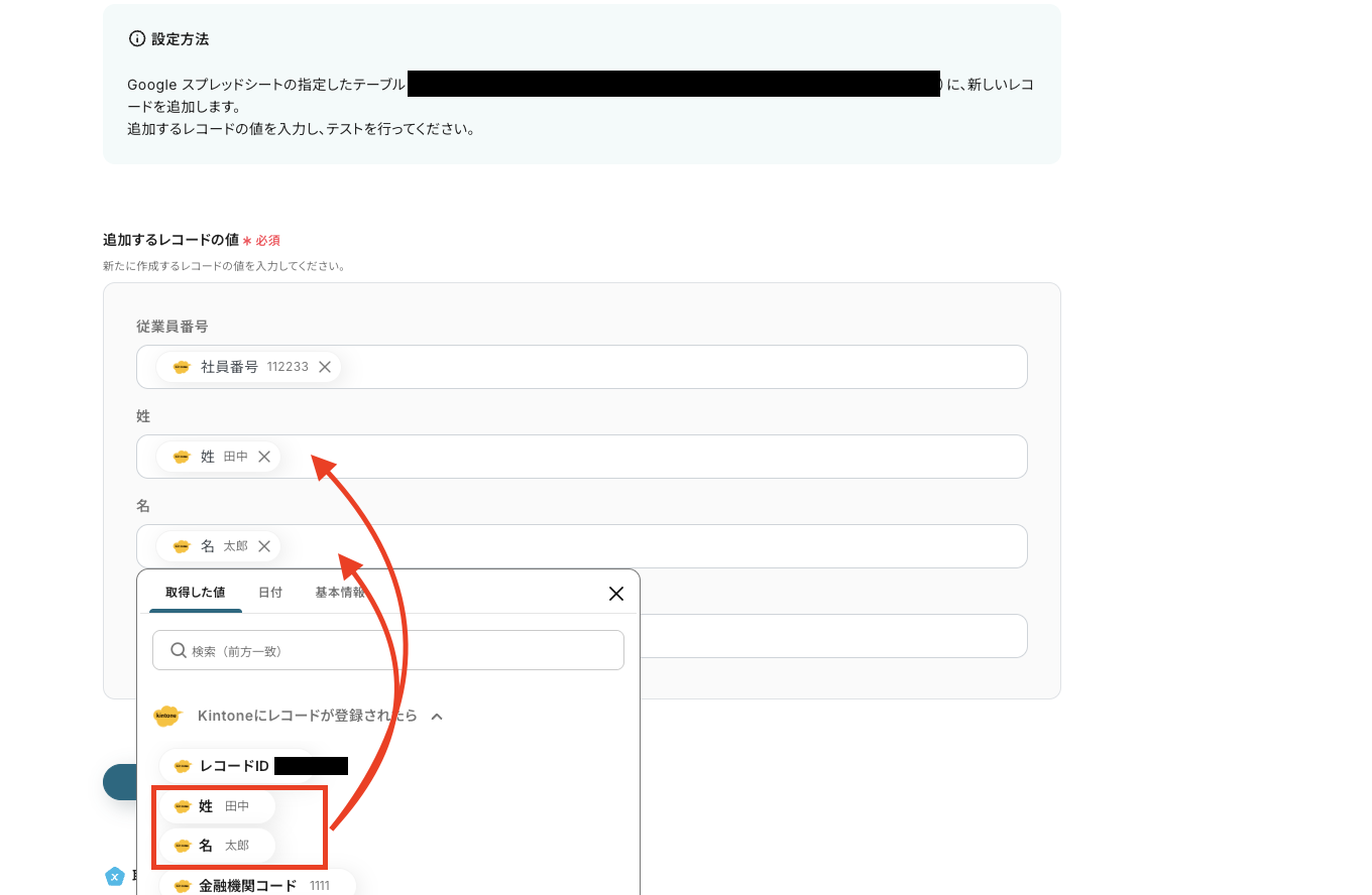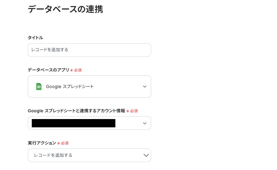 次に追加するレコードの値の画面に以降します。ここで表示されているボックス名は、先ほど連携したGoogle スプレッドシートのヘッダと連動しています。