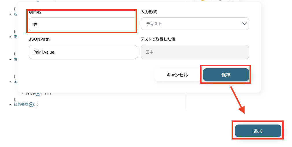 鉛筆マークをクリックすると項目名を編集できるので、kintoneやGoogle スプレッドシートで設定されている項目名に統一するのがおすすめです。編集後は保存して、取得したい値を全て得られれば[追加]を押します。