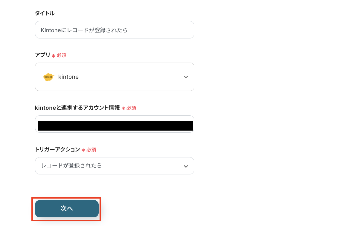 まずは、トリガーとなる「Kintoneにレコードが登録されたら」をクリックして、連携するアカウント情報が入力されていることを確認してください。確認後、[次へ]をクリックします。