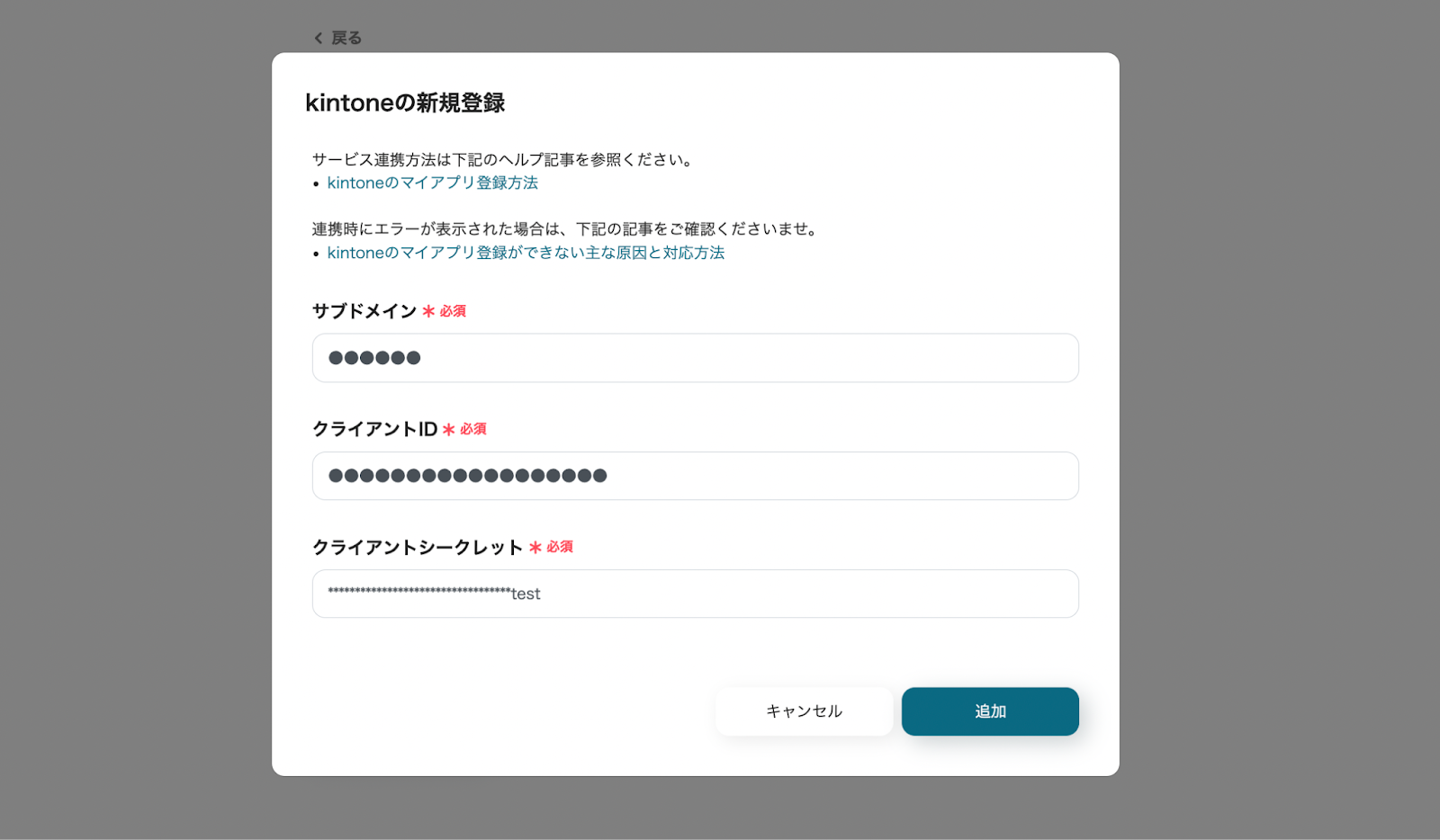 以下の画面が表示されるので、「サブドメイン」、「クライアントID」、「クライアントシークレット」を入力後、[追加]をクリックします。