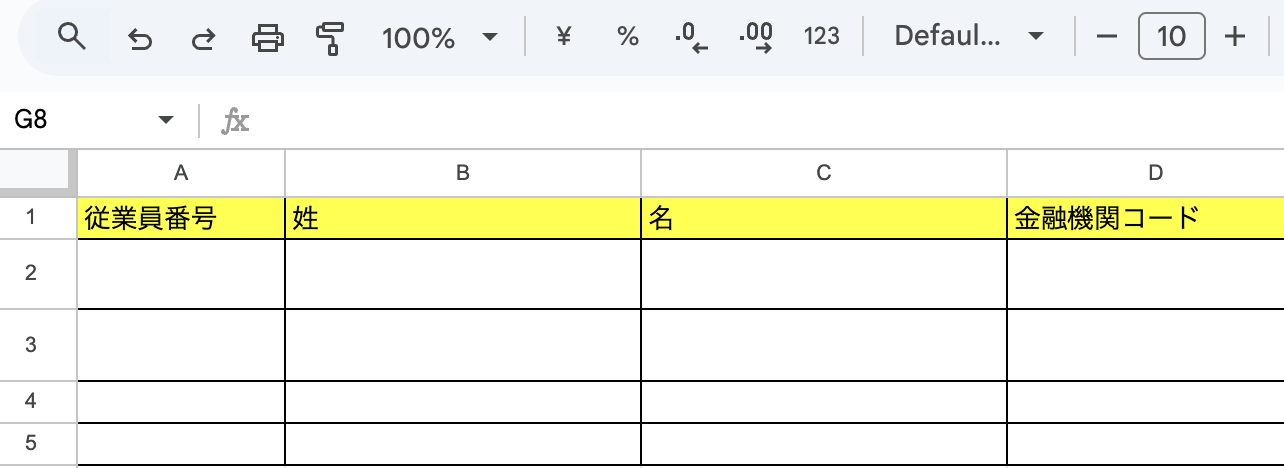 今回は以下のような、従業員情報を管理するシートを事前に作成しています。シートの表やヘッダーに関する注意点があるので、こちらのページも確認してくださいね。