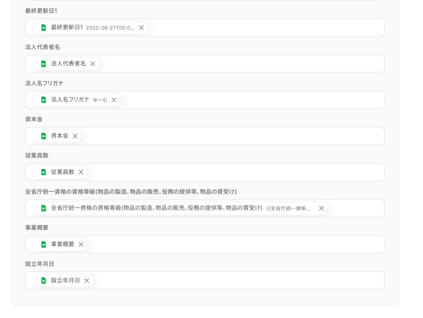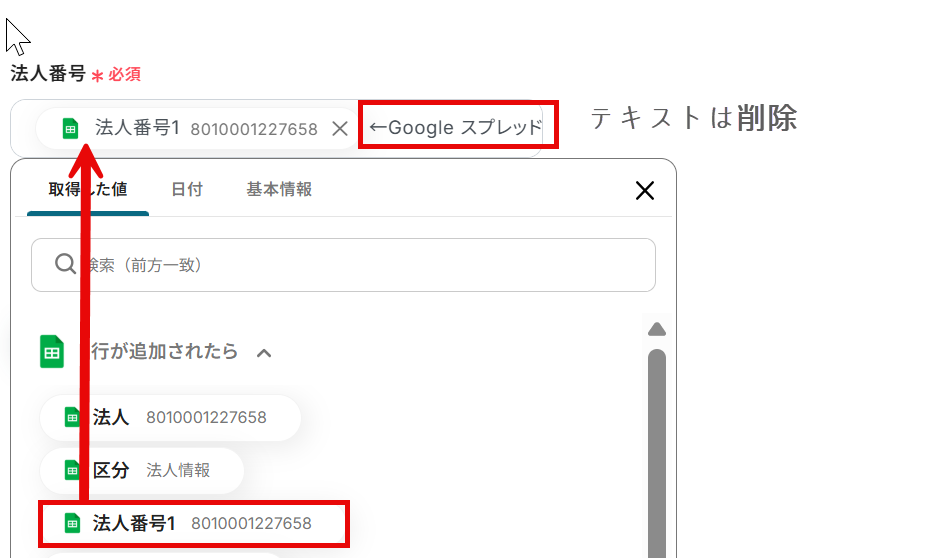 法人番号のフィールドをクリックし、前項でアウトプットした「法人番号」を選択します。
