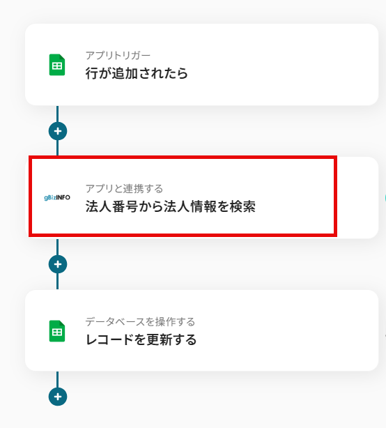 このワークフローを活用すれば、Google スプレッドシートに法人番号を含む行を追加するだけで、gbizINFO(経済産業省)とのAPI連携により法人情報を自動で検索し取得することが可能です。