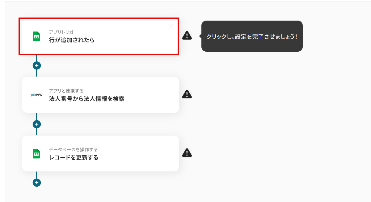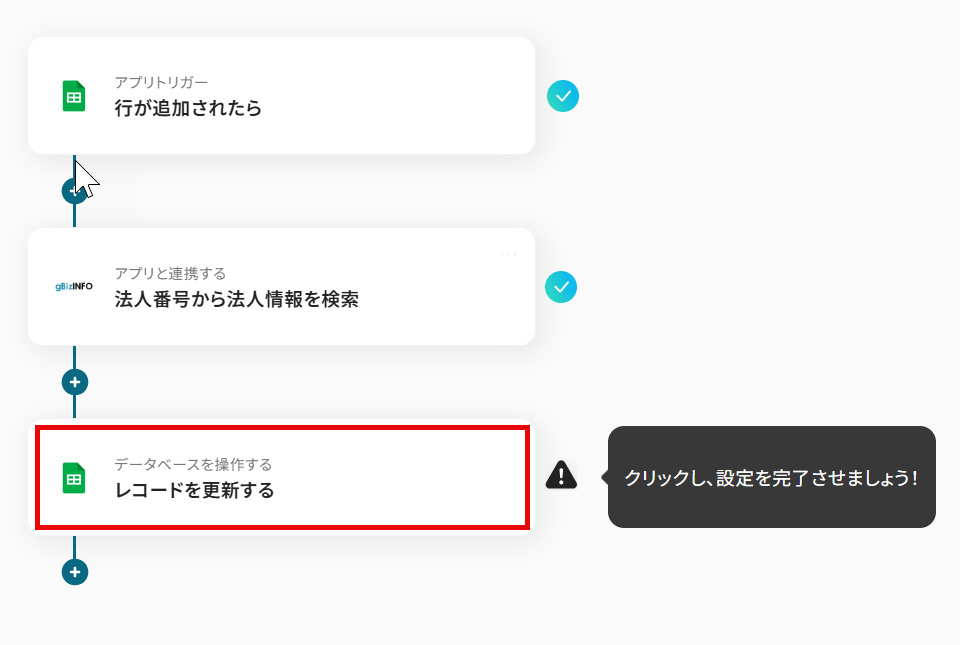 このワークフローを活用すれば、Google スプレッドシートに行を追加するだけで、gbizINFO(経済産業省)のAPIを通じて法人情報が自動で取得・追記されるため、こうした定型業務を効率化できます。
