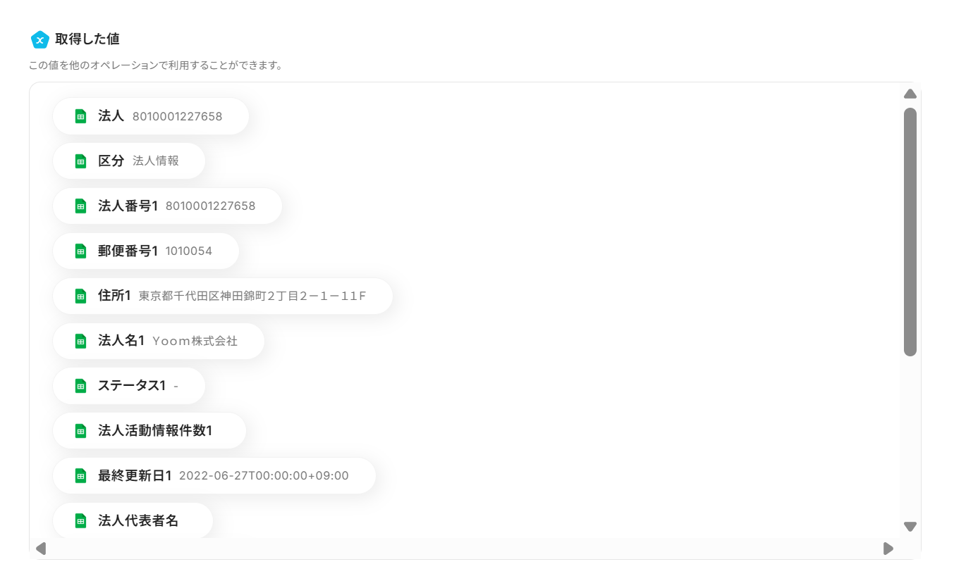 gBizINFO APIの法人情報検索アクションをフローの中に組み込むことで、指定した法人番号をもとに商号、所在地、更新年月日といった詳細な法人情報を自動で取得できます。