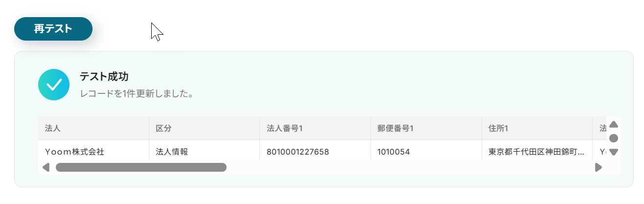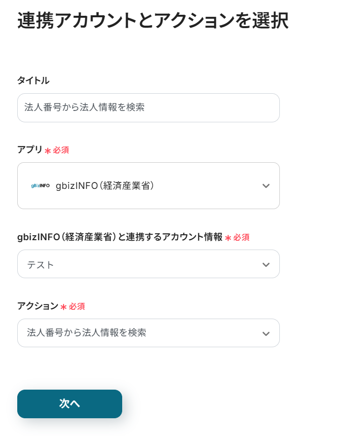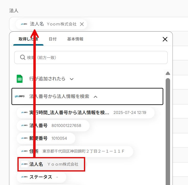法人名から情報を検索するアクションを活用することで、法人番号が不明な場合でも企業名をもとに法人情報を自動で取得し、業務フローに組み込むことが可能です。