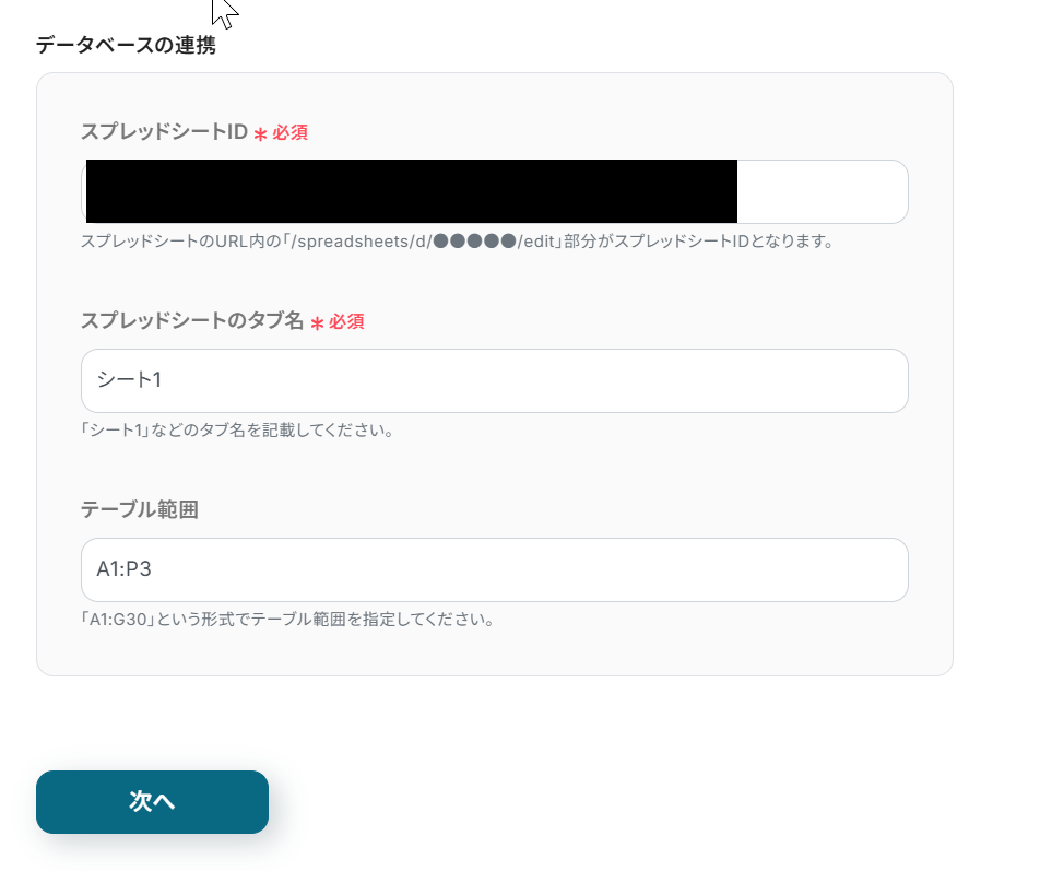 「テーブル範囲」には実際のGoogle スプレッドシートの範囲を注釈の指示のとおり入力し、「次へ」をクリックしましょう。