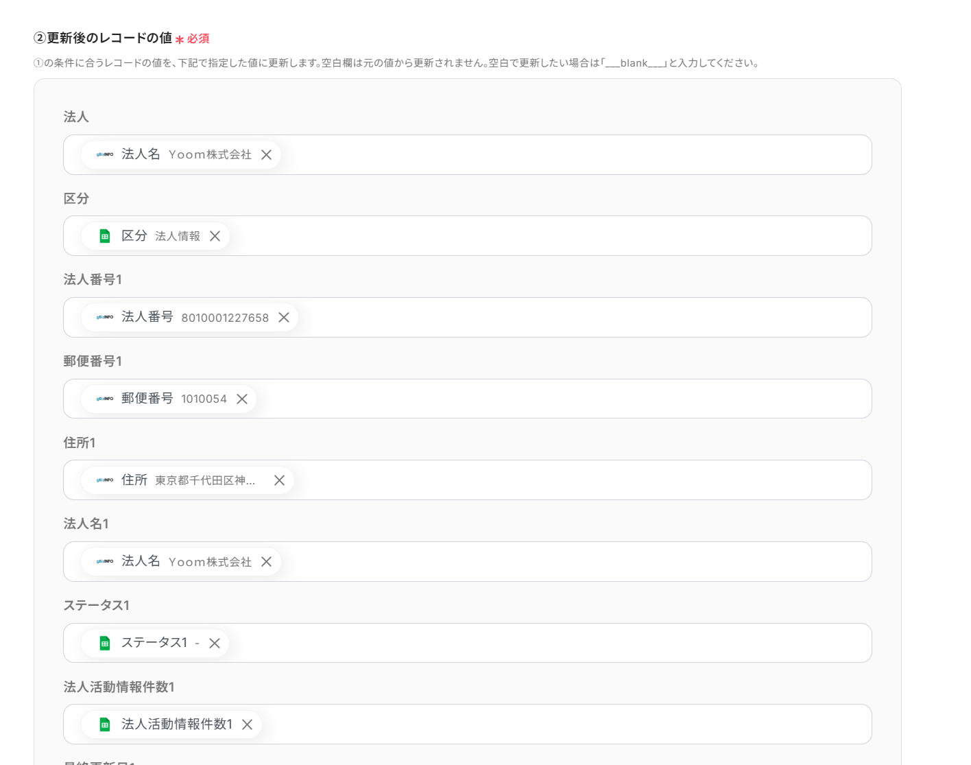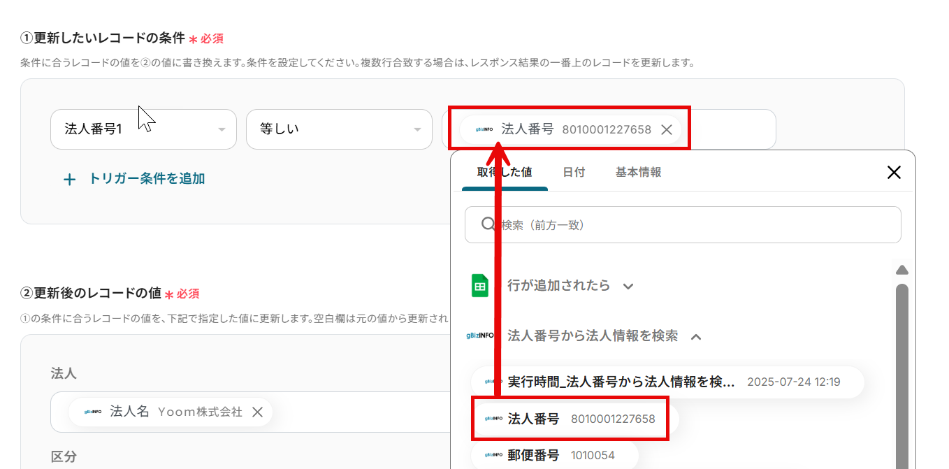 - ①更新したいレコードの条件:前項でアウトプットした「法人番号」を選択