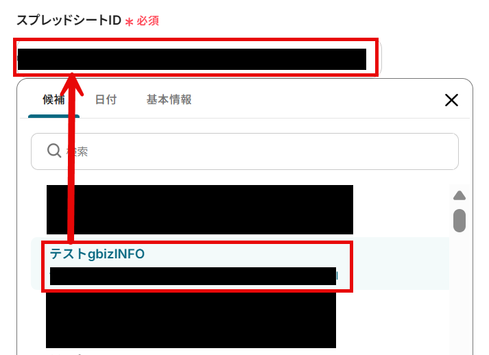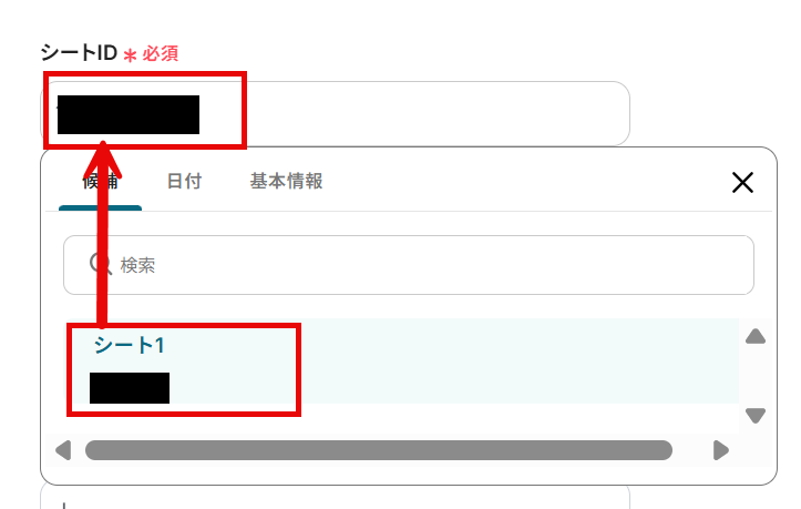 スプレッドシートIDはフィールドをクリックすると候補が出てくるので連携したいシートを選択します。注釈のURL内のIDを入力することもできます。