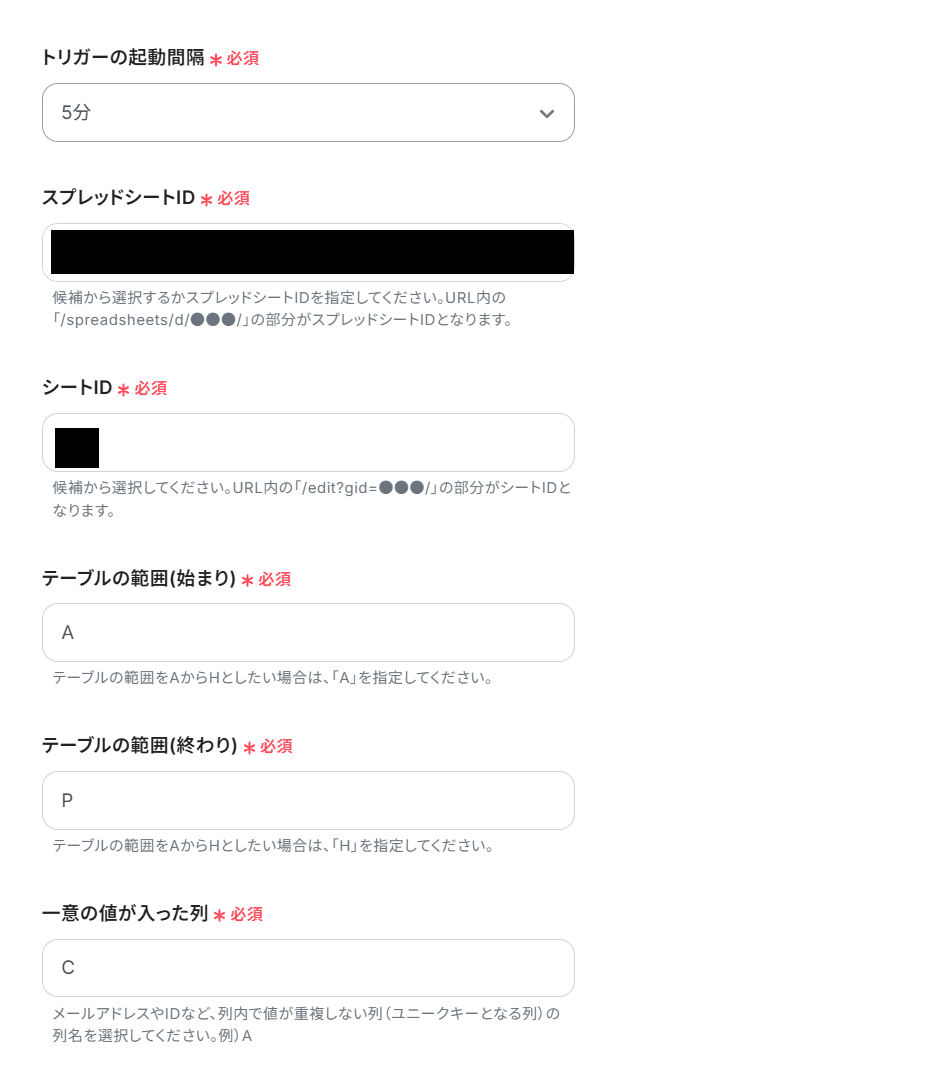 前項と同様に「スプレッドシートID」「シートID」を入力します。