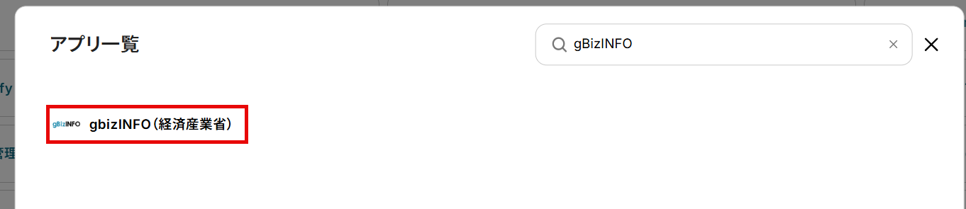 検索窓からgBizINFO(経済産業省)を検索し選択します。