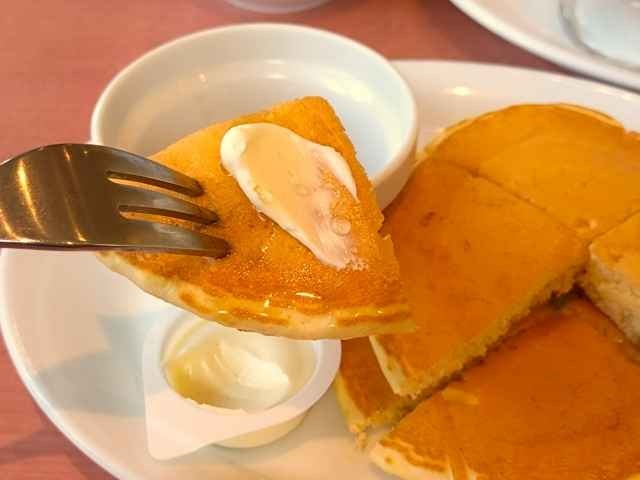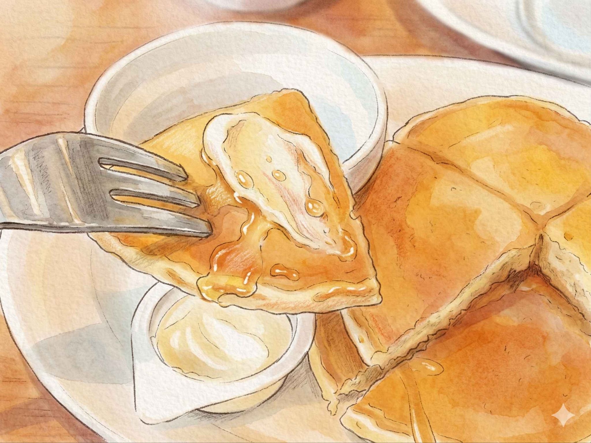 パンケーキの写真を、絵本のようなあたたかみと親しみやすさのある「手描き風水彩イラスト」に変換します。
