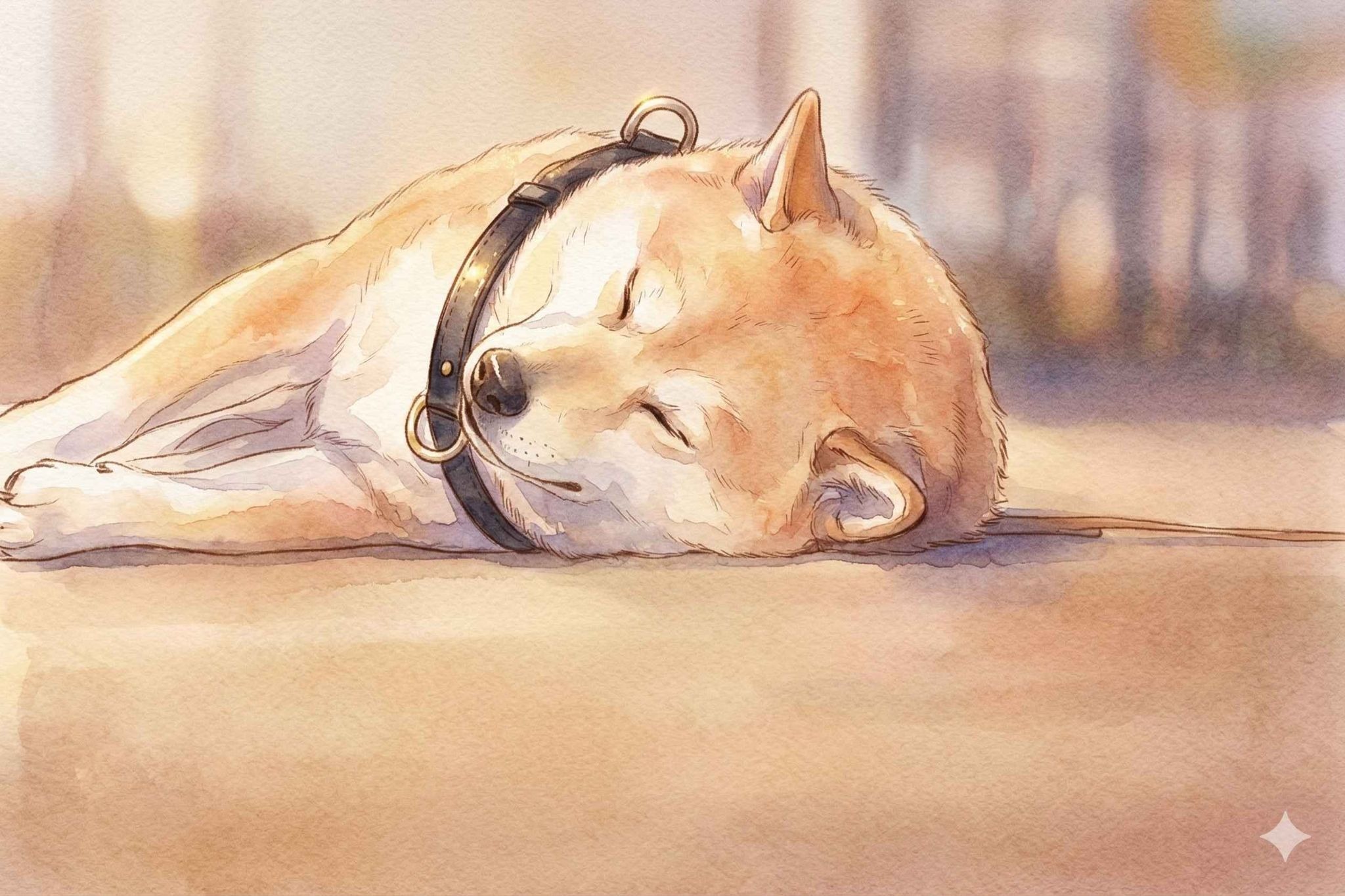 愛らしい柴犬が眠る写真をベースに、元の写真の構図と西日のあたたかさを維持しつつ、高品質な「アニメ風水彩イラスト」へ変換する検証です。