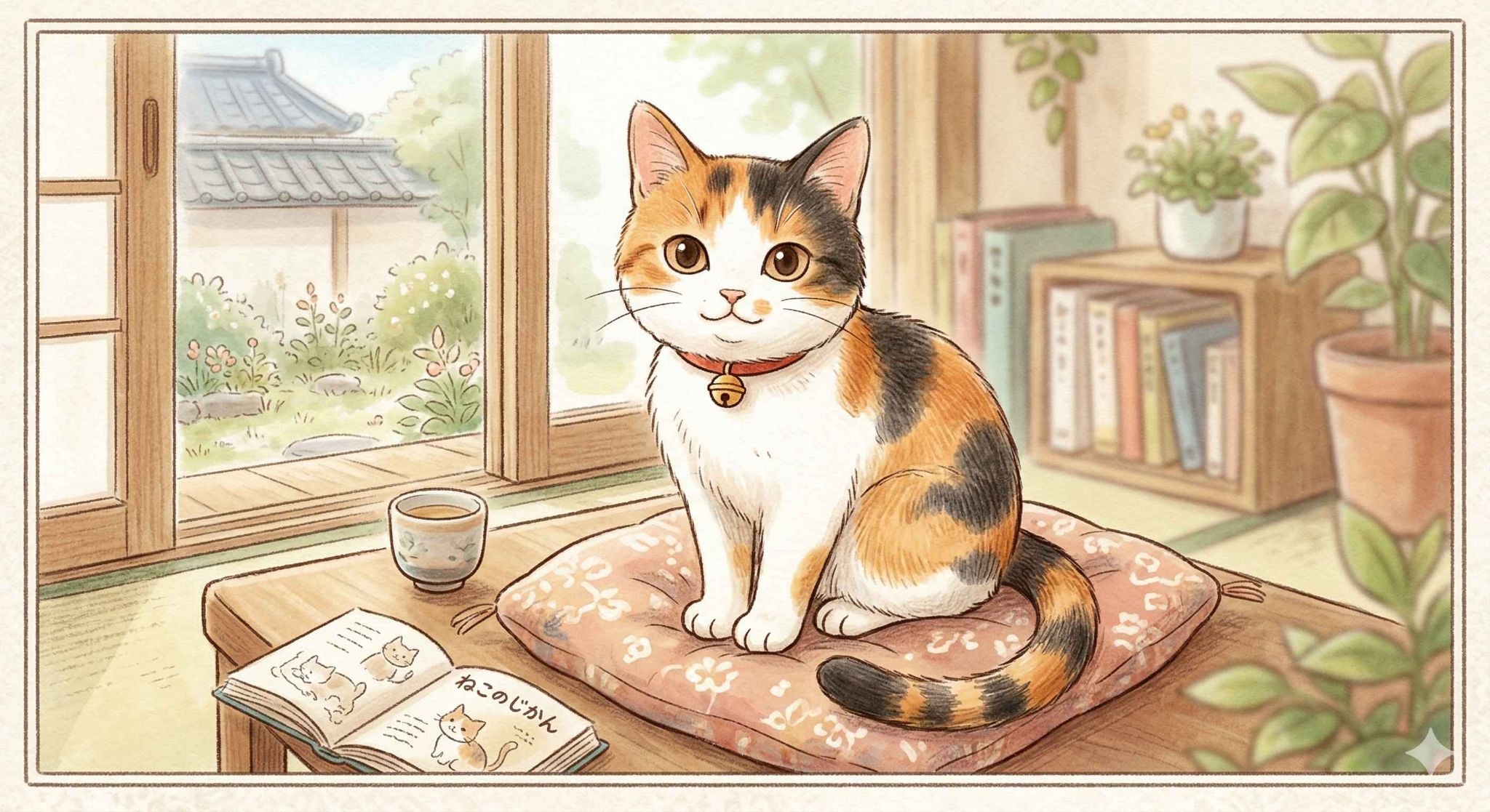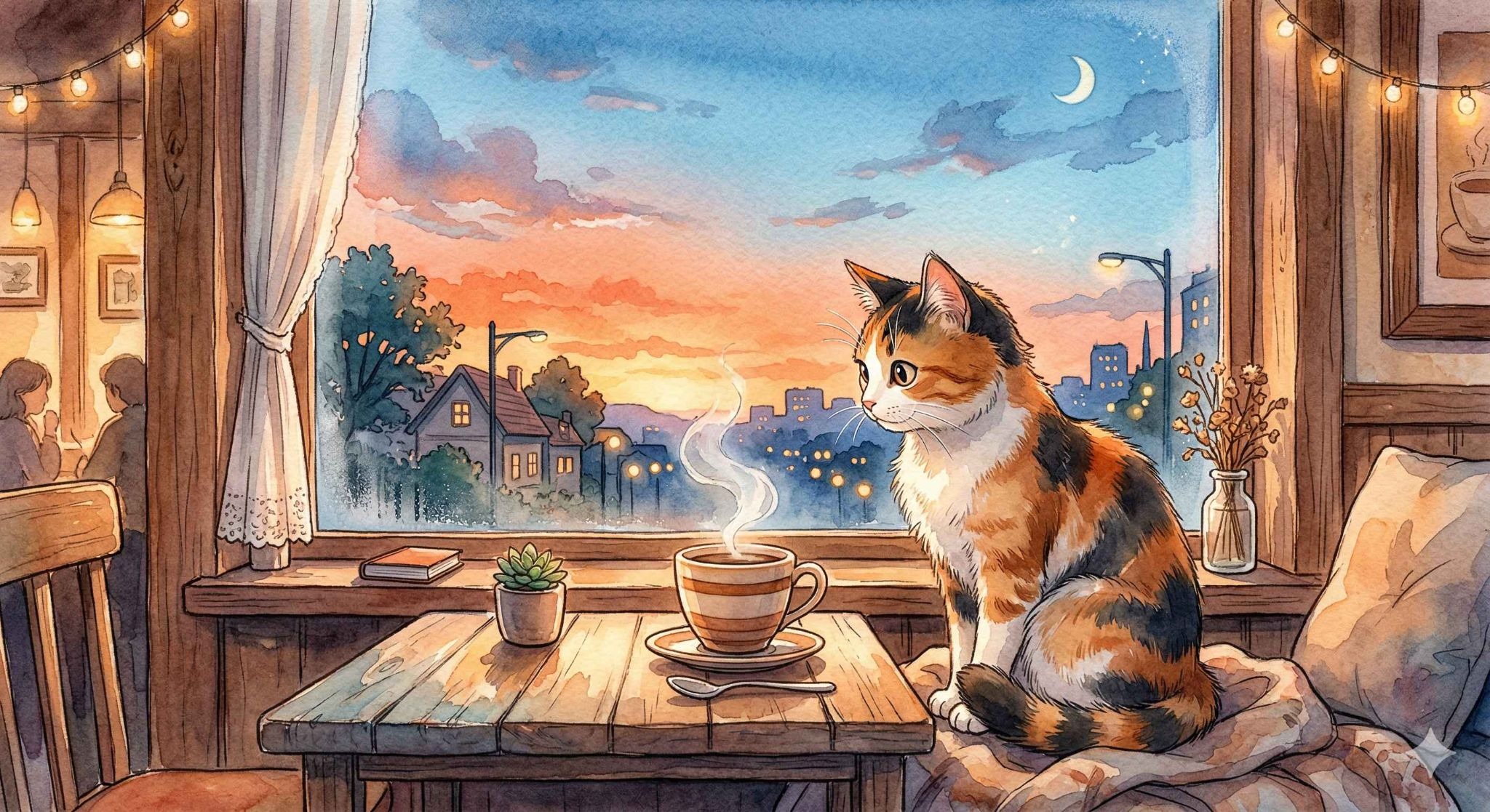夕暮れのカフェの窓辺で、温かいコーヒーカップを見つめる三毛猫のアニメ風イラスト。全体的にオレンジと淡い青のグラデーションがかかった水彩画タッチで と、被写体・背景・状況・配色・画風を詳細に指定してみました。