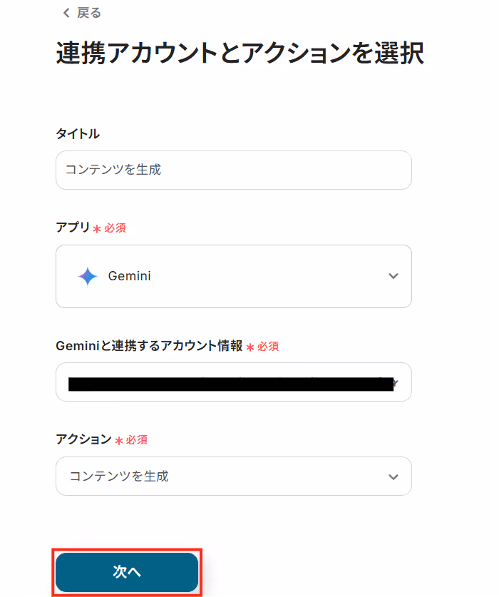 連携するアカウント情報には、ステップ1で連携したアカウント情報が反映されています。トリガーアクションはそのままにして、「次へ」をクリックしてください。
