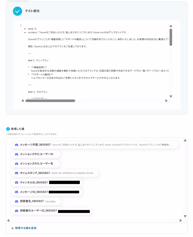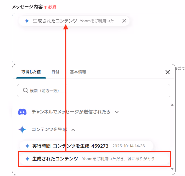 なお、その際プロンプトに取り入れるDiscordのメッセージ内容は取得した値から選択してください。取得した値を活用することで、固定値ではなく、トリガーが実行されるたびに最新の情報が反映できます。