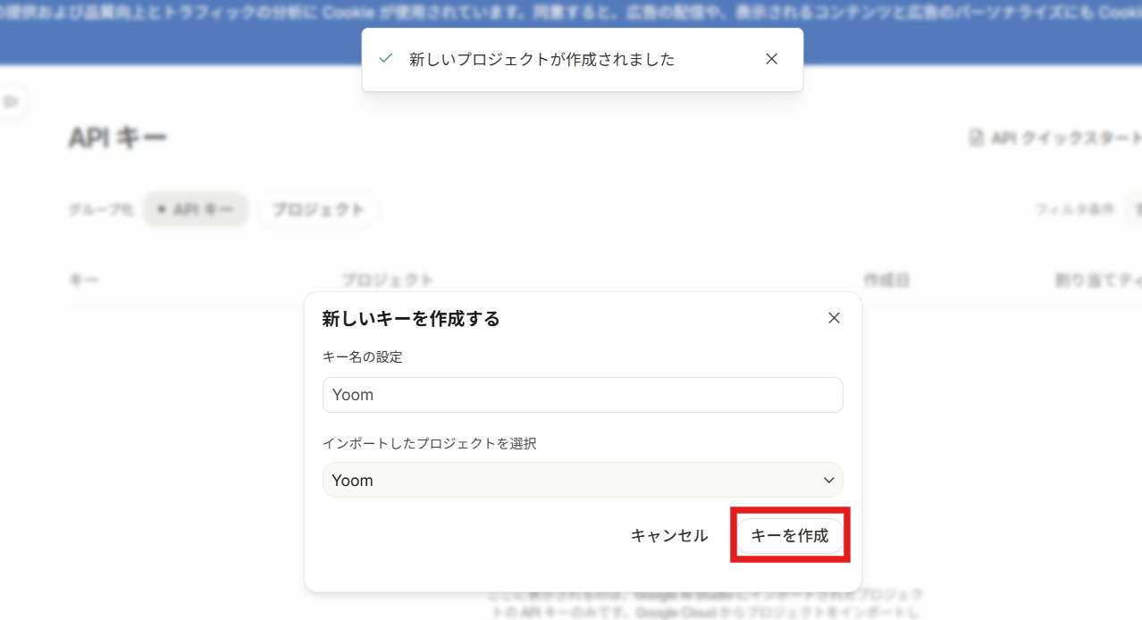 プロジェクトを作成するとAPIキーも作成可能になります。赤枠をクリックしましょう。