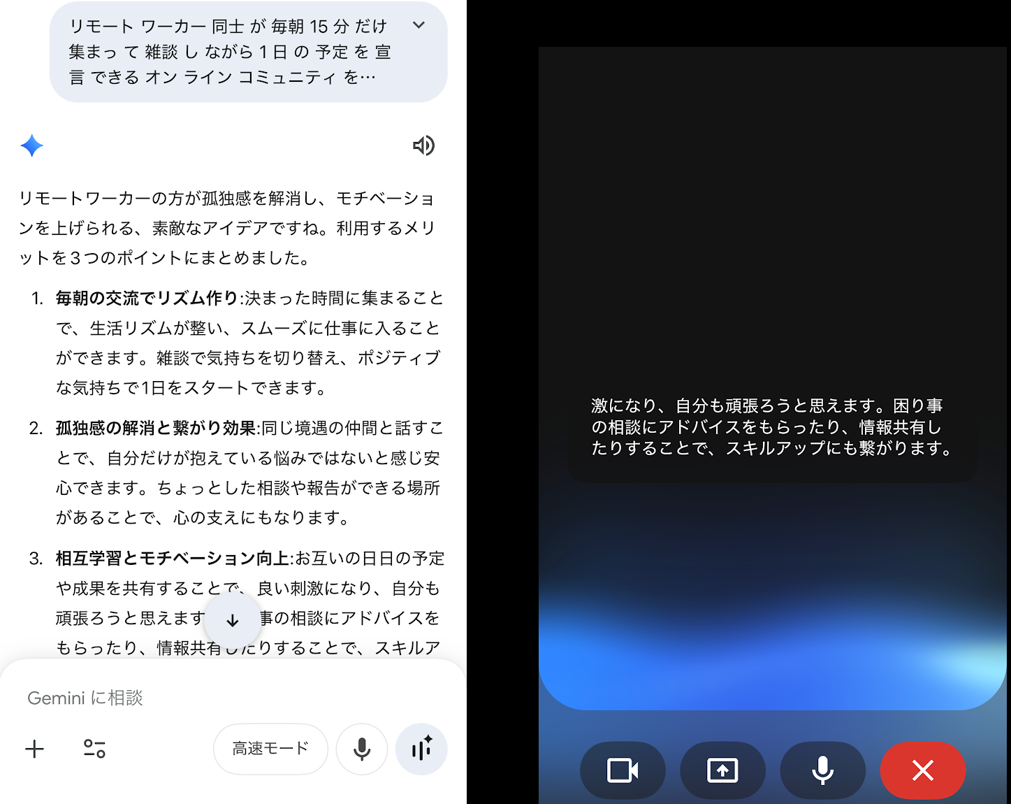 音声による指示を終えると、Geminiから穏やかな声で返答がありました。