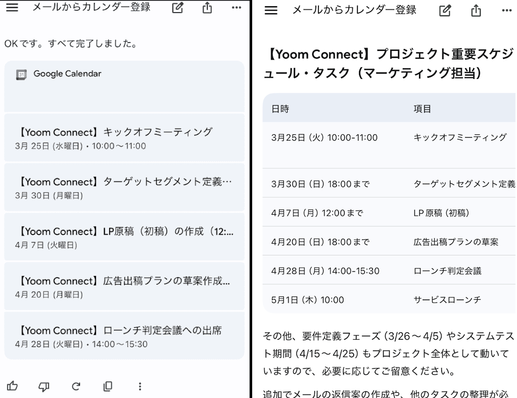メールの文面から正確に日時と内容を抽出しているのがお分かりいただけるかと思います。