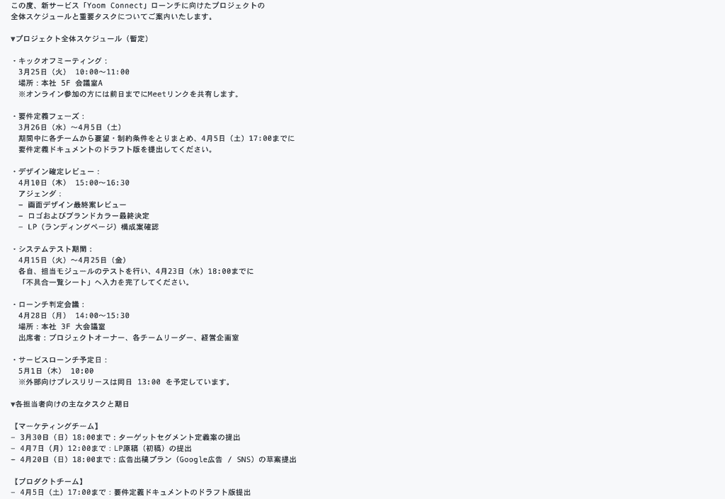 最初の検証として、Gmailで受信した長文のプロジェクト案内メールをGeminiに読み込ませ、Googleカレンダーに予定を登録してもらいます。