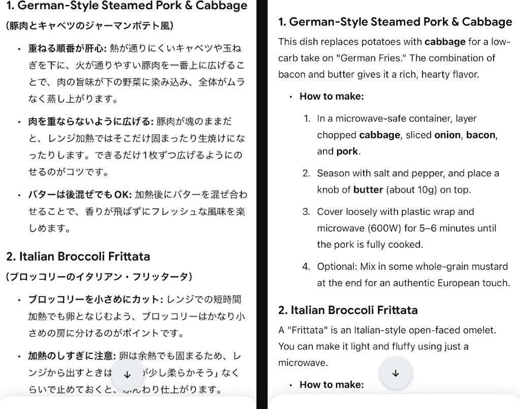 海外料理にも挑戦したいと考えた時、外国語のメニューを翻訳しつつ調理のポイントを聞いてみましたが、翻訳もスムーズにこなしてくれました。