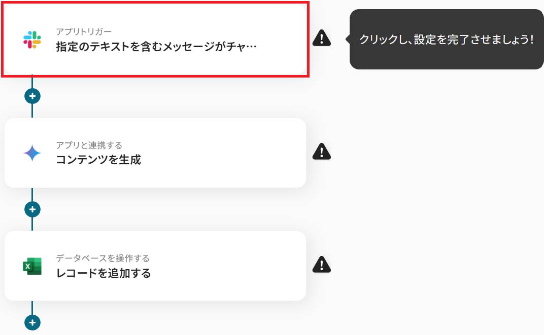 「指定のテキストを含むメッセージがチャンネルに投稿されたら」をクリック。