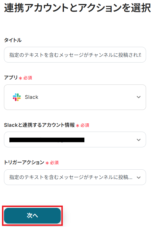 タイトルと連携するアカウント情報を任意で設定し、トリガーアクションはテンプレート通りに「指定のテキストを含むメッセージがチャンネルに投稿されたら」のまま「次へ」をクリックします。