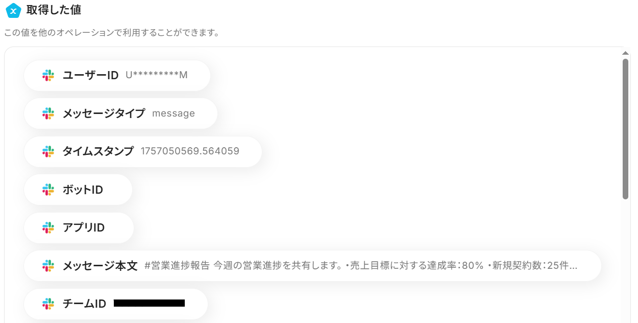 テストが成功すると取得した値が表示され、Slackのデータを確認できます。