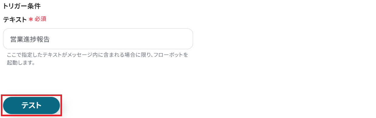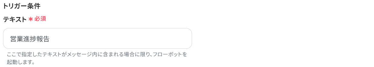 今回は例として「営業進捗報告」というテキストが含まれている場合にフローボットを起動するよう設定しています。