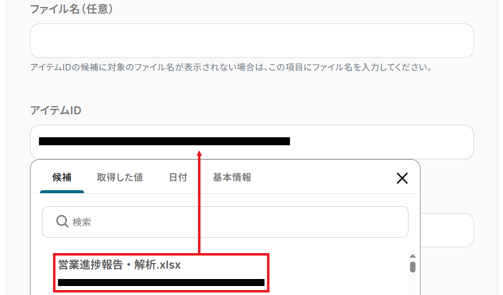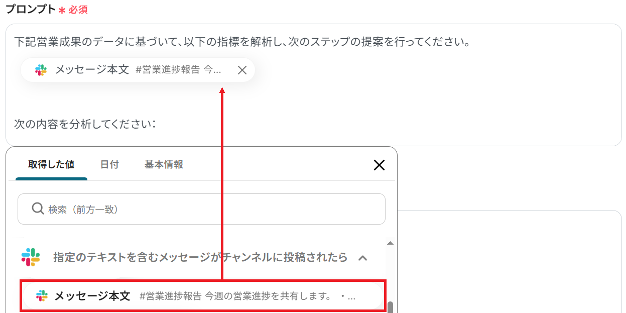 なお、テキストを直接入力した部分は固定値とされるため、下記画像のように「下記営業成果のデータに基づいて、以下の指標を解析し、次のステップの提案を行ってください。」などのプロンプトは手入力し、毎回変動することが望ましい「メッセージ本文」は取得した値を活用しましょう。