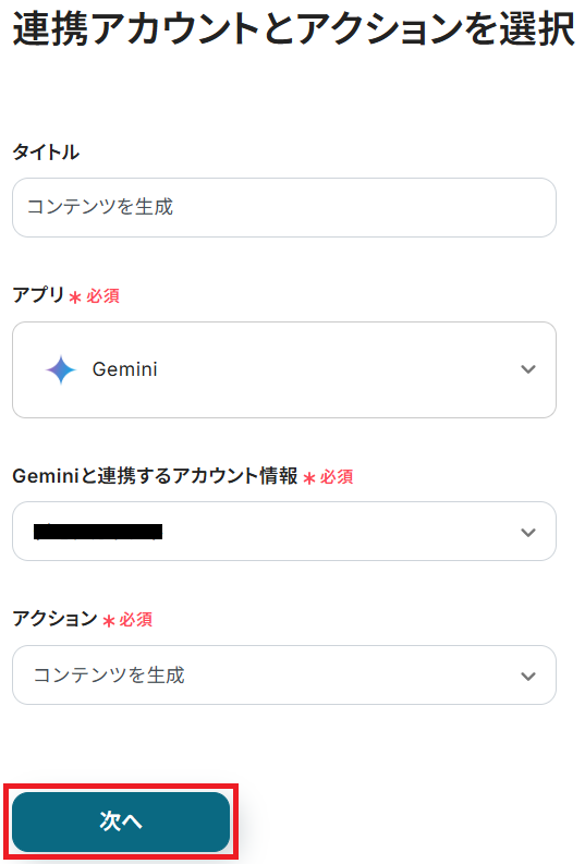 ステップ3と同様、アクションは「コンテンツを生成」のまま「次へ」をクリック。