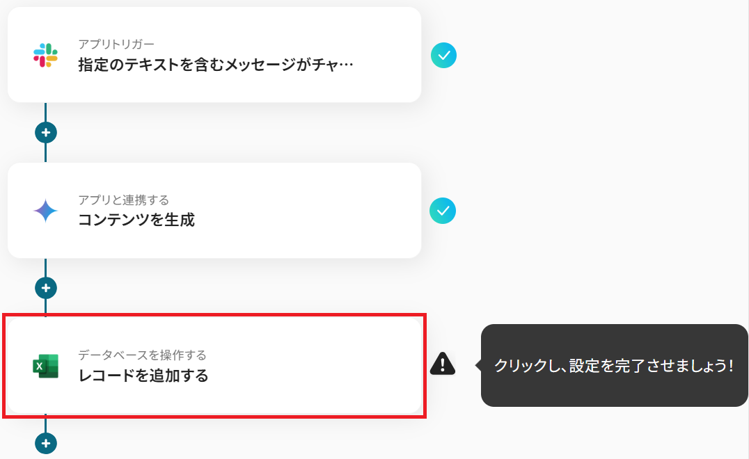 このワークフローは、Slackの特定メッセージをトリガーに、Geminiが内容を解析し、Microsoft Excelへ自動でレコードを追加します。