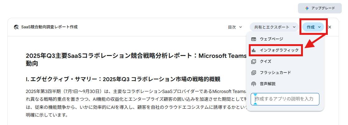 ビジュアル化:画面右上の「作成」ボタンから、レポート内容を基にしたインフォグラフィックやグラフを即座に生成可能です。
