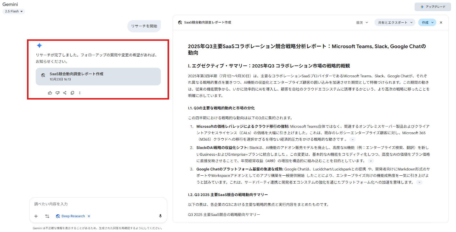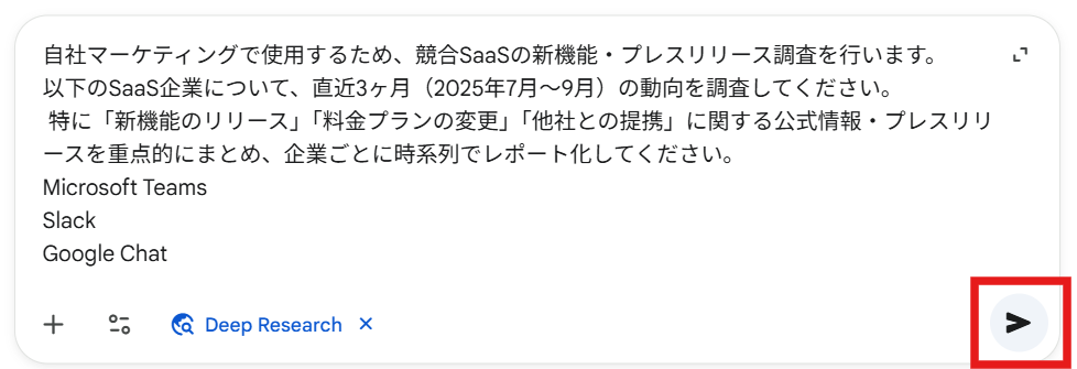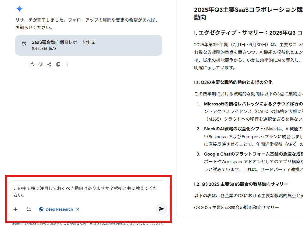目的:自社マーケティングの参考にするため、競合SaaS(Microsoft Teams, Slack, Google Chat)の直近3ヶ月の動向を知りたい。 使用モデル:Gemini 3(無料アカウント)